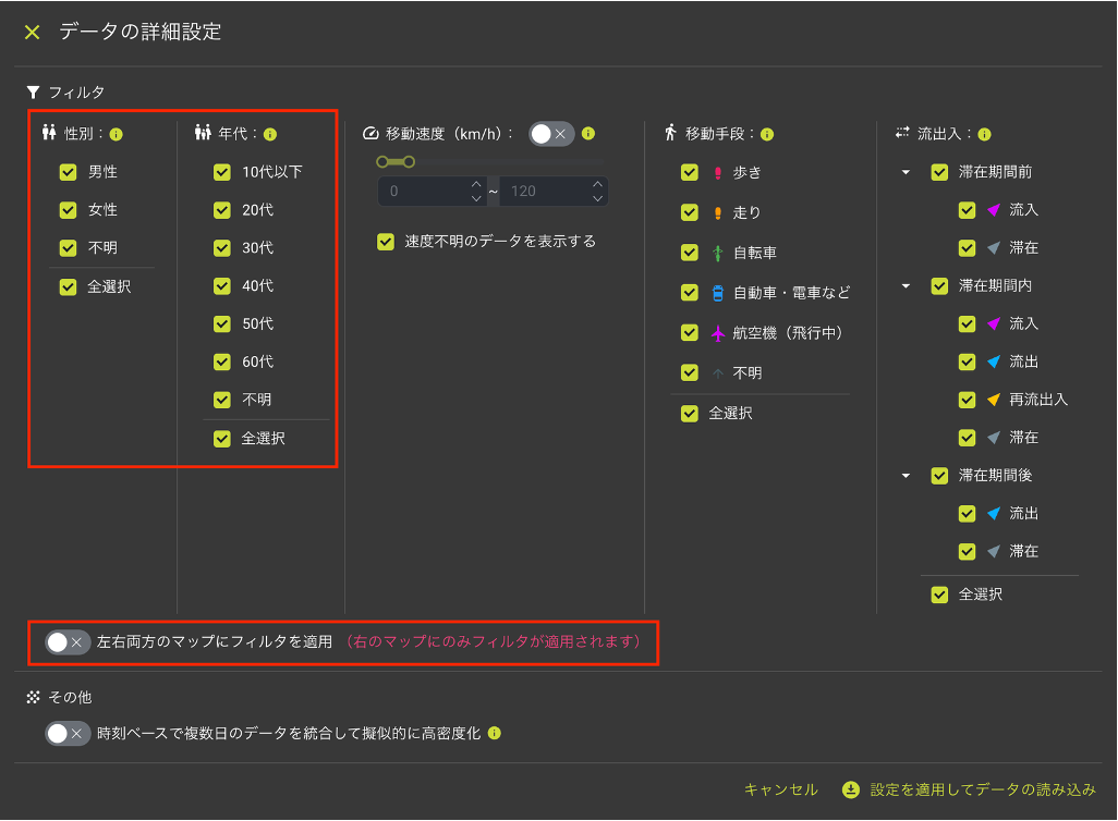 人の流れを動画で比較・分析できる「コンプレノ」機能アップデートのお知らせ 2025.10.20 いつもAgoop提供サービス「コンプレノ」をご利用いただき、誠にありがとうございます。このたび調査対象エリアの人の流れを1分単位で分析し、状況変化を動画で比較・分析できる「コンプレノ」の可視化分析機能をアップデートしましたのでお知らせします。 【アップデートの概要】 ■ 滞在条件を指定してデータ作成可能滞在範囲で図形(ポリゴン・駅・円)など複数の分析エリアを作成した場合、滞在条件(OR/AND) を指定してデータ作成ができるようになりました。 ■ 性別・年代によるデータのフィルタ指定可能データを性別や年代で絞り込むことができる「性別・年代フィルタ」を新たに追加しました。特定のターゲット層に絞った、より詳細なデータ分析が可能になりました。 ■ ユーザビリティーの向上1. メッシュの地名・住所単位で集約を実現。観光施設等の“混雑している場所”が直感的に把握可能に。2. 混雑ランキング結果をCSV形式ファイルでデータダウンロード可能。外部のGISやExcelファイルでの分析にも利用可能に。3. 2画面表示機能で左右の比較画面ごとに異なるフィルタの設定が可能。男性と女性の比較や、年齢層ごとの傾向など把握が容易に。 ■ アップデート実施日2025年10月20日(月) ■ 「コンプレノ」について「コンプレノ」は、日本全国どこでも、お客さまが指定した施設や観光地などへの人の流れや、市区町村内での人の動きを動画で可視化し、出店戦略の策定や都市開発、観光、防災など、広範囲な分野でビジネス課題解決の意思決定を支援しています。その他の機能や活用例は、「コンプレノ」のサービス紹介ページをご覧ください。https://agoop.co.jp/service/kompreno/ Agoopは今後も、より良いサービスをご提供できるよう努めてまいりますので、ご愛顧賜りますよう、よろしくお願い申し上げます。 お知らせ一覧 前の記事