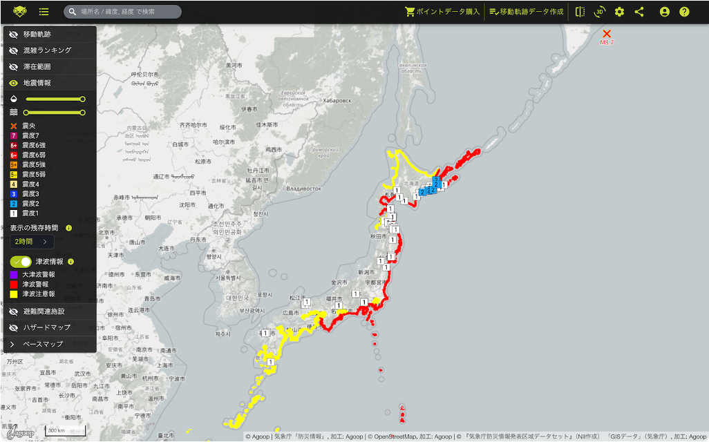 人の流れを動画で比較・分析できる「コンプレノ」機能アップデートのお知らせ 2025.12.01 いつもAgoop提供サービス「コンプレノ」をご利用いただき、誠にありがとうございます。このたび調査対象エリアの人の流れを1分単位で分析し、状況変化を動画で比較・分析できる「コンプレノ」の可視化分析機能をアップデートしましたのでお知らせします。 【アップデートの概要】 ■ 津波情報表示機能の追加津波予報区に発表されている津波警報・津波注意報などの津波情報に応じて、海岸線が色分け表示されるようになりました。地震・津波情報は、移動軌跡レイヤの表示期間に基づき表示されます。津波情報の発表による避難行動が、よりわかりやすく可視化できるようになりました。 ■ 等高線表示機能の追加ベースマップ上に等高線を表示できるようになりました。津波情報の発表により高台に避難している状況など、標高に関連する行動をよりわかりやすく可視化できるようになりました。 ■ ユーザビリティーの向上1. 移動軌跡データ作成画面でのベースマップスタイルの変更が可能に。2. 分析エリアの指定範囲を拡大。都道府県を跨いで5つまで市区町村を指定可能に。 ■ アップデート実施日2025年12月1日(月) ■ 「コンプレノ」について「コンプレノ」は、日本全国どこでも、お客さまが指定した施設や観光地などへの人の流れや、市区町村内での人の動きを動画で可視化し、出店戦略の策定や都市開発、観光、防災など、広範囲な分野でビジネス課題解決の意思決定を支援しています。その他の機能や活用例は、「コンプレノ」のサービス紹介ページをご覧ください。https://agoop.co.jp/service/kompreno/ Agoopは今後も、より良いサービスをご提供できるよう努めてまいりますので、ご愛顧賜りますよう、よろしくお願い申し上げます。 お知らせ一覧 前の記事 後の記事